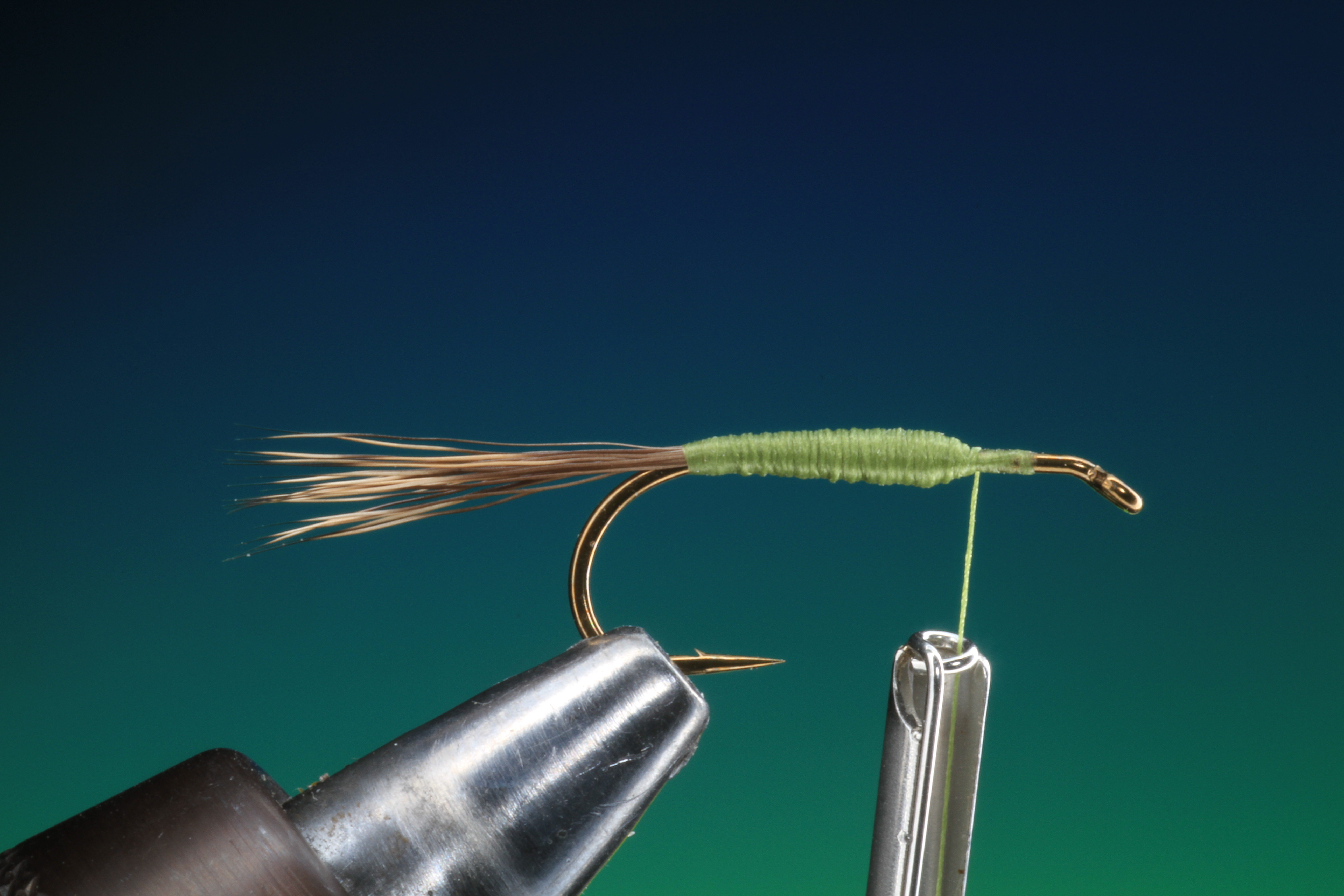 Cut a small bunch of fine deer hair and even the points in a hair stacker, so all the tail fiber point are even. Tie the tail in as shown about 2/3 the body length. Run your tying thread over the hook shank and build up a slightly tapered body again about 2/3 the hook shank length.