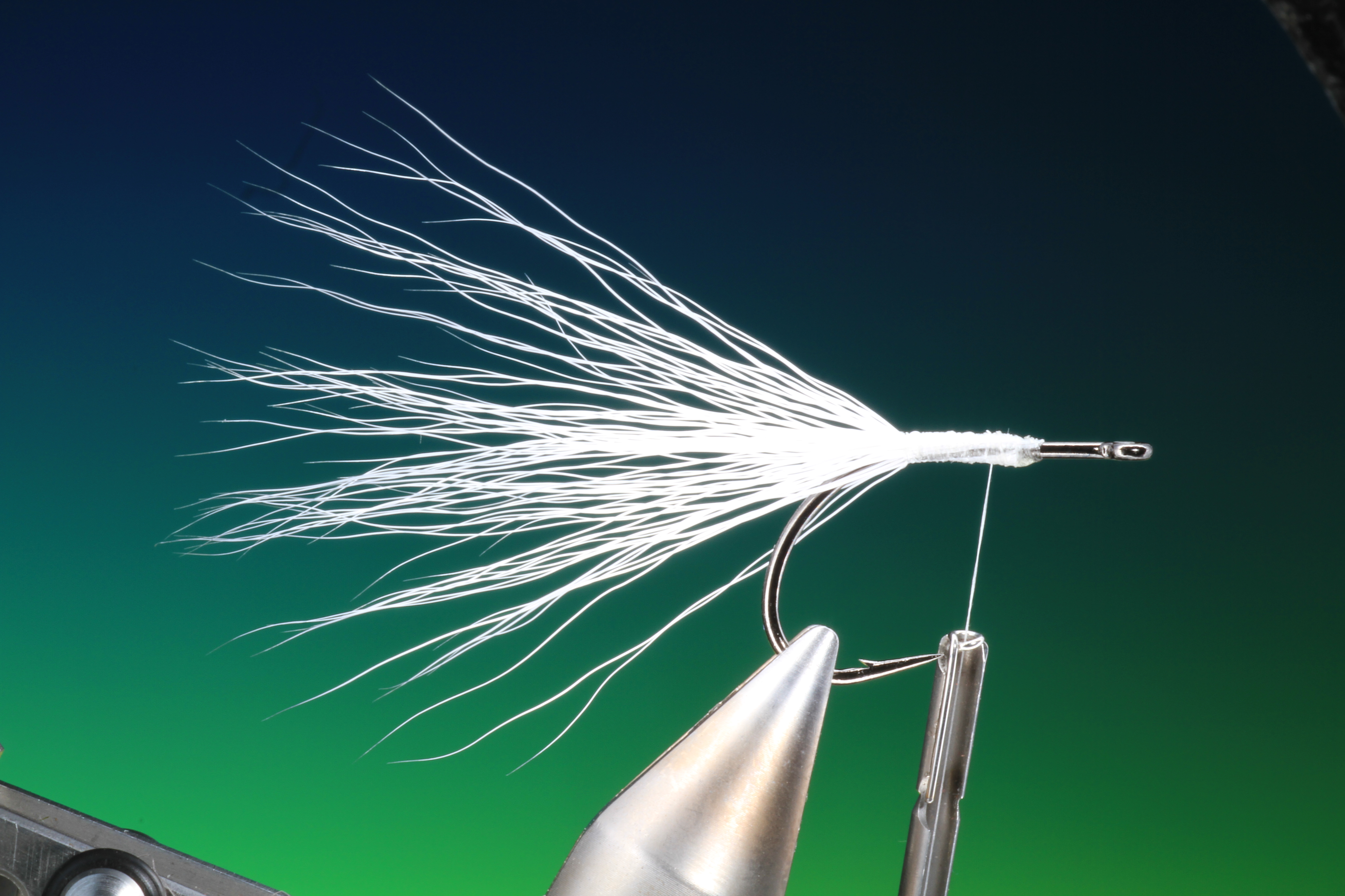 3 Cut a small bunch of white buck-tail. I use Spirit rivers UV2 buck-tail to give the effect of a translucent underbody.