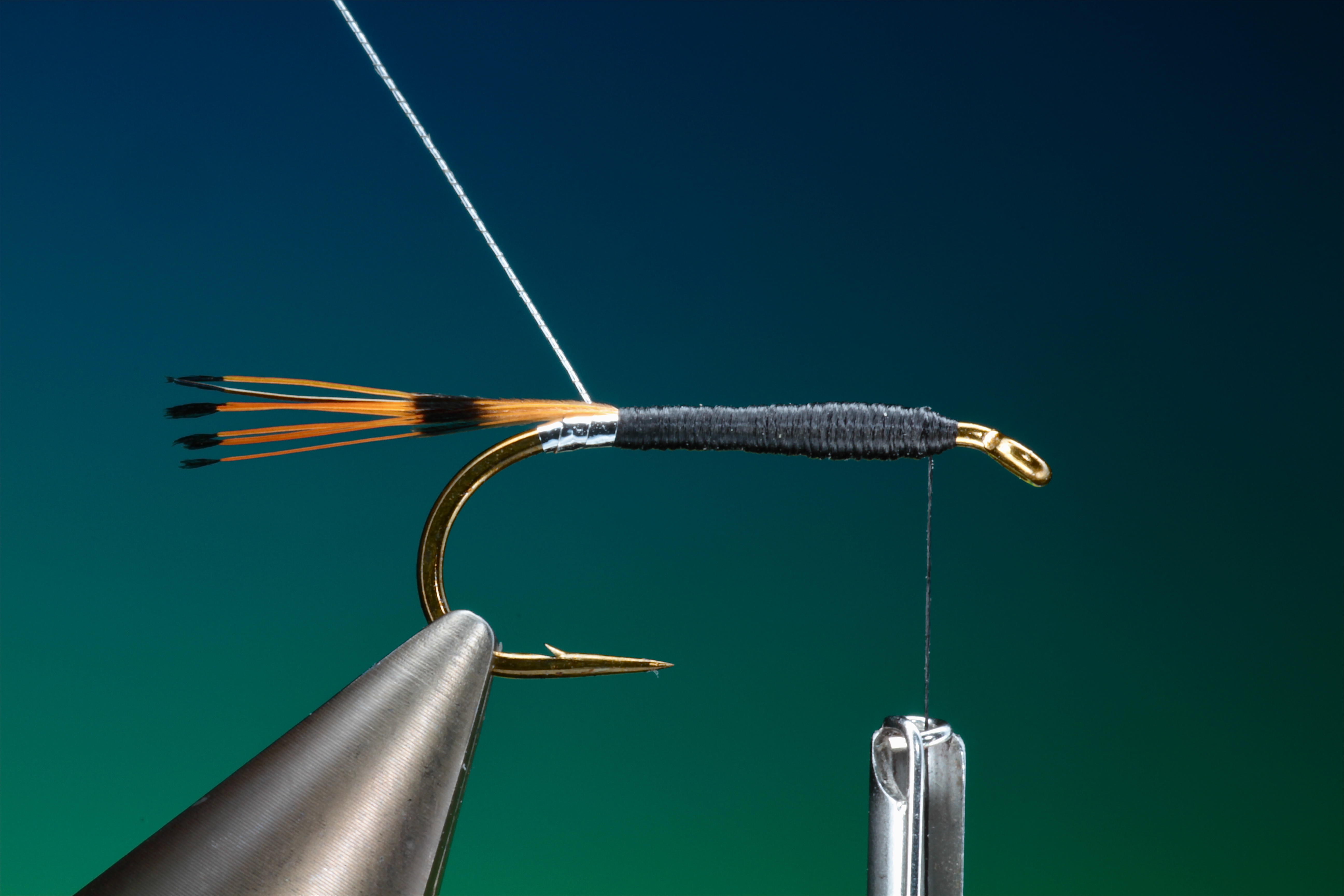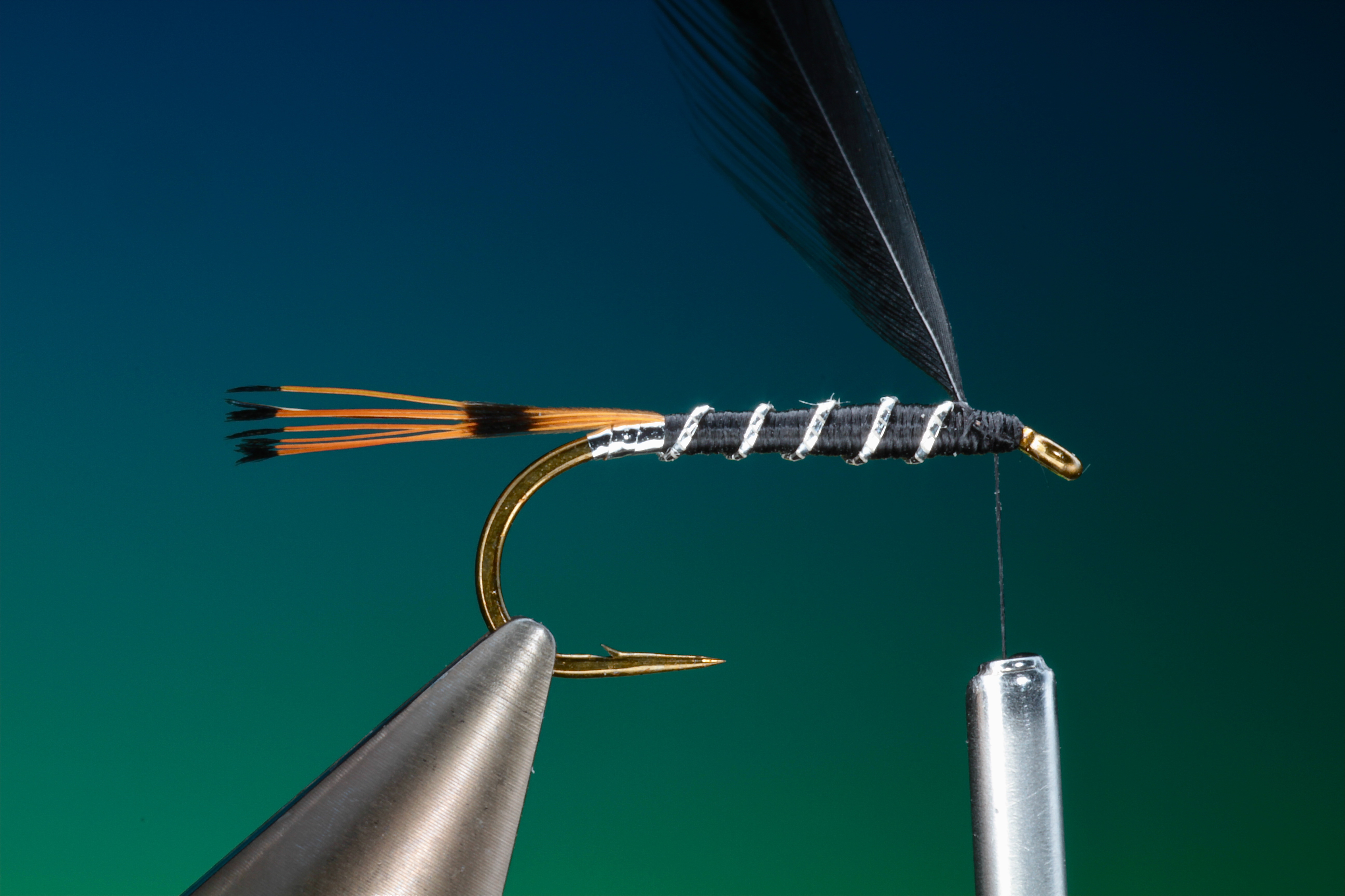 Select and prepare a long fibered black cock hackle and tie in where the tinsel finishes. Wind your tying thread forward to just behind the hook eye.