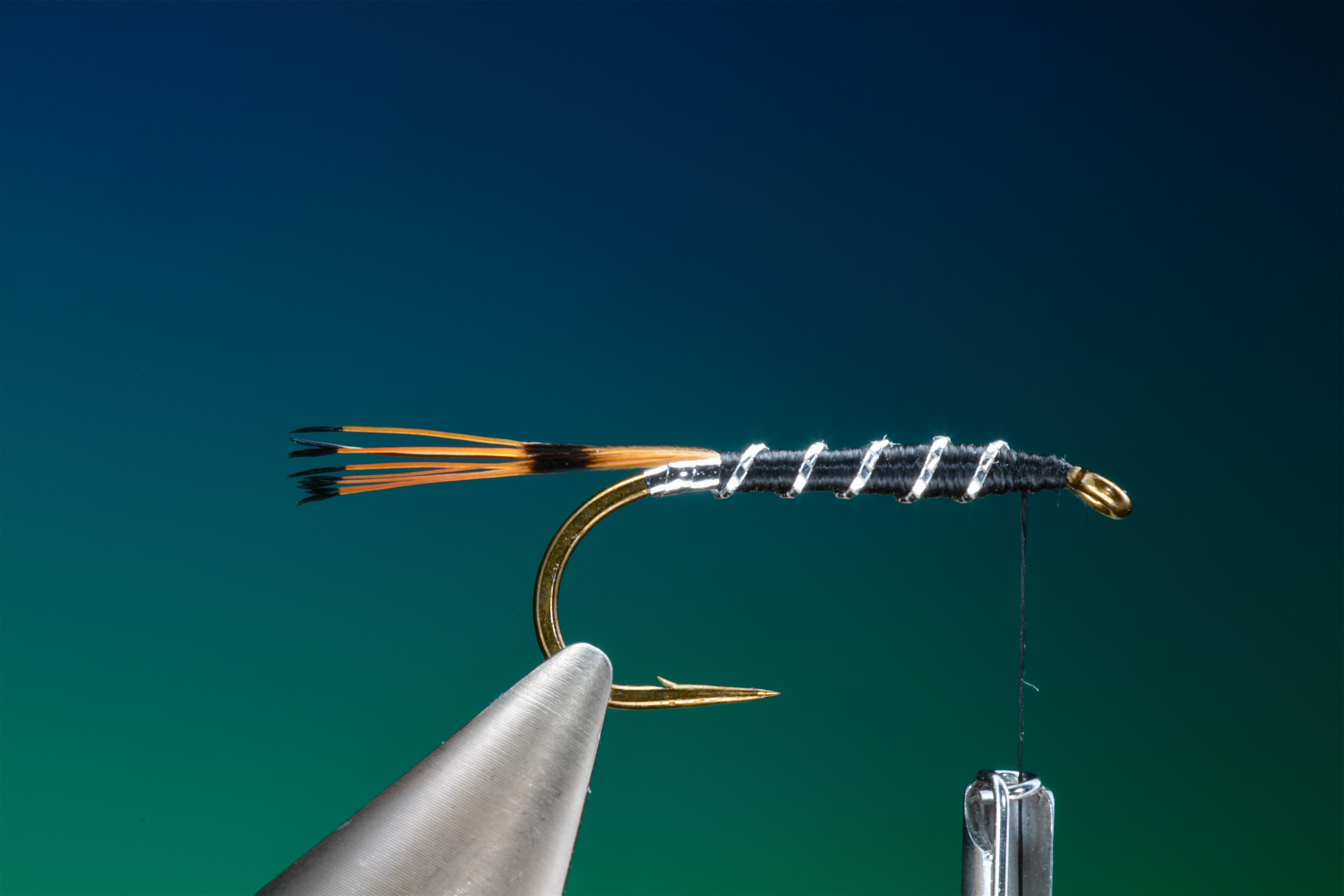 This variant with a slim silver tinsel body is preferred for salmon and sea trout. sometimes tied with a hot orange dyed tippet tail.